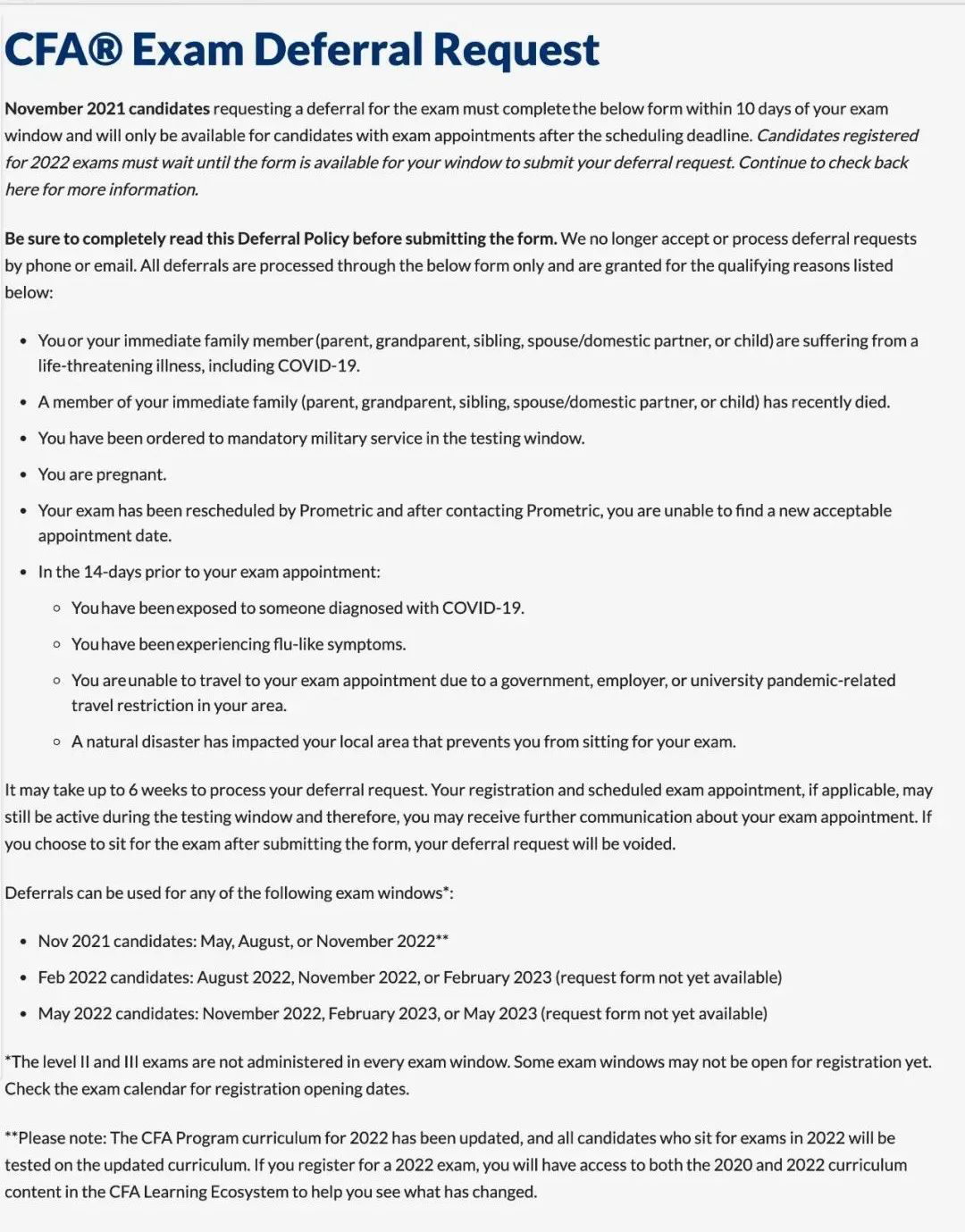此延期通道不仅适用11月考试,2022年2月和5月窗口的CFA考试同样适用,但是目前仅11月可以申请,2022年2月和5月考试目前此申请表还不可以使用;因为有些考试窗口尚未开放注册!
