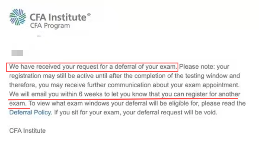 注意:处理您的延期申请最多可能需要 6 周时间。您的注册和预定的考试预约(如果适用)在考试窗口期间可能仍然有效,因此您可能会收到有关您的考试预约的进一步信息;