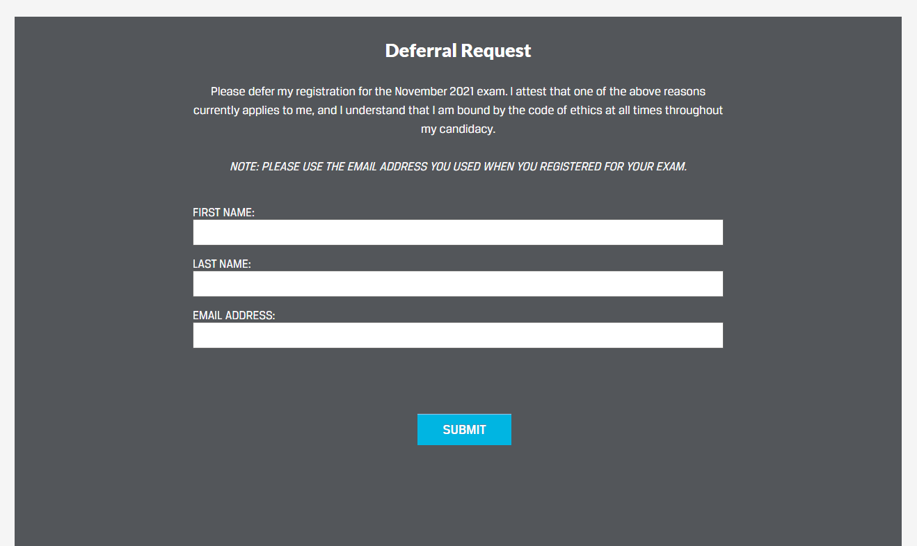 CFA协会明确规定不在通过电话和电子邮件接收或处理延期请求,所有延期仅通过以下表格处理,所以满足条件的11月考生可以进行延期申请了,很简单,只需要填写页面中的一个表格,填写自己的姓、名、邮箱,点击提交即可。