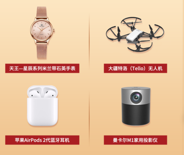 华为 MateBook笔记本电脑、iPad 10.2 256G/64G、曼卡尔家庭投影、大疆特洛益智编程无人机套装、天王表星辰系列简约手表、苹果AirPods 2代蓝牙耳机、Kindle经典版32G/8G、华为蓝牙鼠标等超多大礼等你来拿。