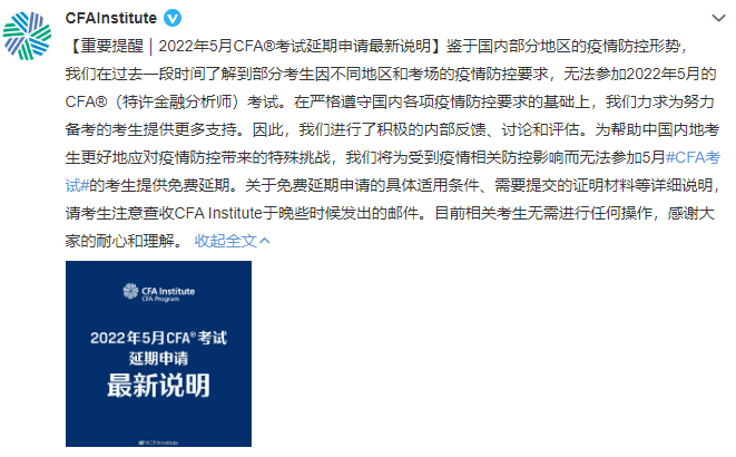昨天CFA协会官博发文,称鉴于国内部分地区的疫情防控形势,为帮助中国内地考生更好地应对疫情防控带来的特殊挑战,CFA Institute将为受到疫情相关防控影响而无法参加5月CFA考试的考生提供免费延期。