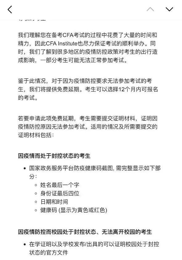 以上就是这次可以申请免费延期的情况,如果你是其他疫情防控要求而无法参加考试,但是不是上述情况,请联系CFA协会全球客服:info@cfainstitute.org