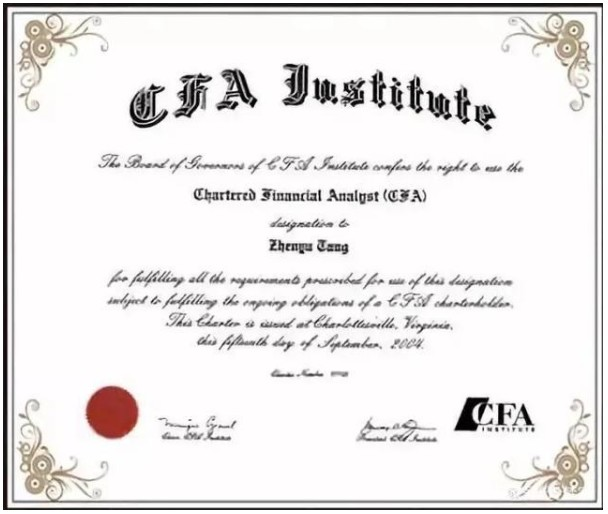 1) CFA官方特许资格认证证书(CFA Charterholder Certificate)