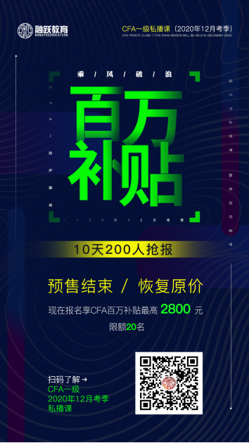 7月是充满毕业的欢笑和离别的悲伤,是一段结束另一征程的开始起点!7月也是融跃教育的品牌月活动,为助力毕业季,融跃教育CFA推出百万补贴助力毕业季的活动!报名2020年12月CFA考生享受zui高补贴2800元!名额有限等你来!