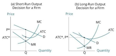 在短期,即便厂家处于亏损状态,但只要收入能覆盖掉固定成本,厂家就会继续生产,而如果厂家覆盖掉固定成本之后还能覆盖了可变成本,说明存在经济利润。由于完全竞争市场没有进出壁垒,因此如果存在经济利润,长期来说,会有新的厂商进入;如果经济利润为负,则原有厂商会选择退出。因此,长期来看,完全竞争市场中厂商的经济利润为0,即ATC=AR=MR=MC=D=P。