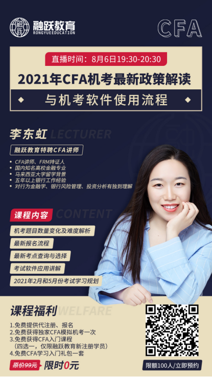 CFA协会公布了2021年CFA考试全部实行机考,这对CFA考生是一个惊天消息,不知道该怎么办,那你还等什么!2020年8月6日融跃在直播间等你一起解读CFA机考!