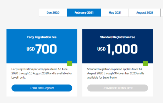 我们可以从官网上看到8月13日是CFA一阶段报名截止的日期,距离这一天的到来仅剩下1天的时间!如果没有抓住这个早鸟阶段,你的报名费就会再多300美金哦!