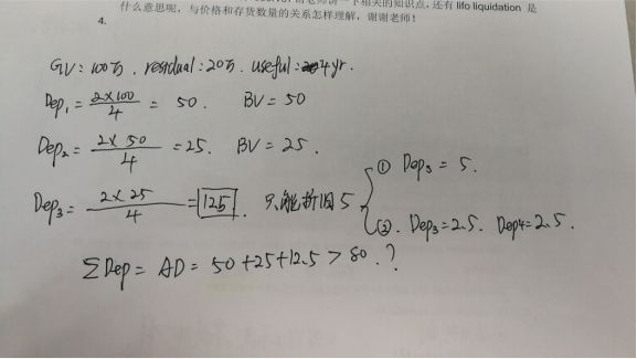 在第3年我们如果用DDB算出来的折旧费用是12.5,但是如果我以12.5来算,我的累计折旧AD,就超过了80,这就错了。因为我们有残值20,所以他的折旧最多可以折80。因此剩下的两年最多还能再折5。