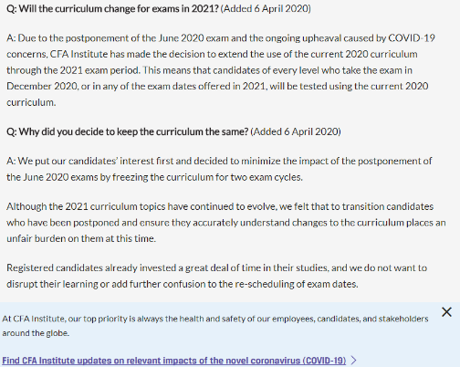 要知道因为疫情加上CFA考试的改革,CFA考试一直在延期,延期到2021年5月才能参加CFA考试,对于接触不多的CFA考生来说是比较难理解的!那教材上CFA官网是怎么说的?
