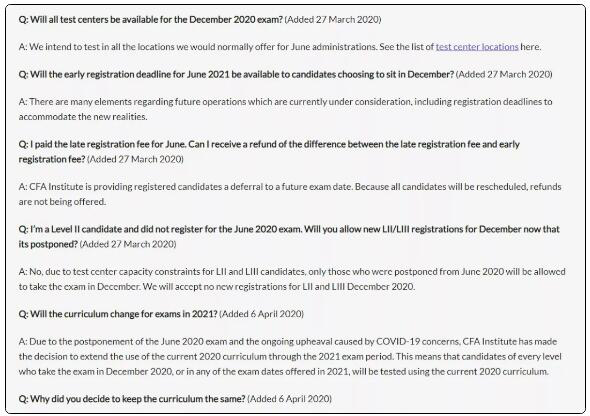 答:由于2020年6月考试延考和新冠疫情引起的剧变。CFA协会决定延长使用2020年考纲至2021年。这意味着任何2020年12月考生或者2021年的考生都会参加以2020年考纲为准的考试。