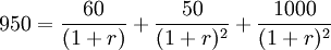 例题:如果票面金额为1000元的两年期债券,第一年支付60元利息,第二年支付50元利息,现在的市场价格为950元,求该债券的到期收益率为多少?